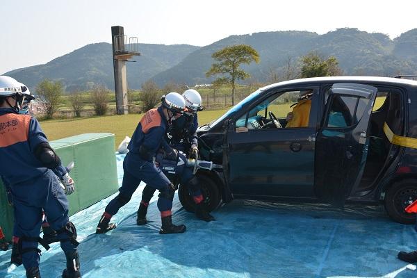 <車内に閉じ込められた要救助者を救出するためサイドドアを破壊し開放している様子>