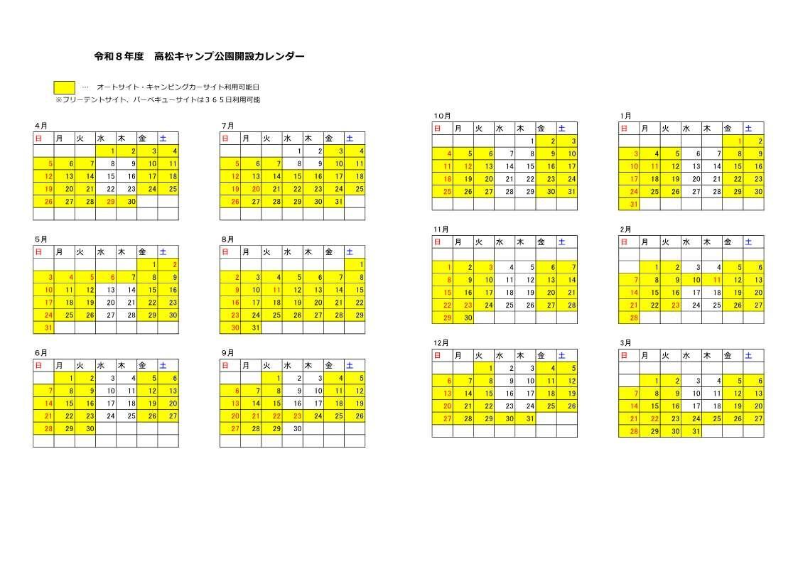 オートキャンプサイト・キャンピングカーサイトの営業日は、カレンダーをご覧ください。