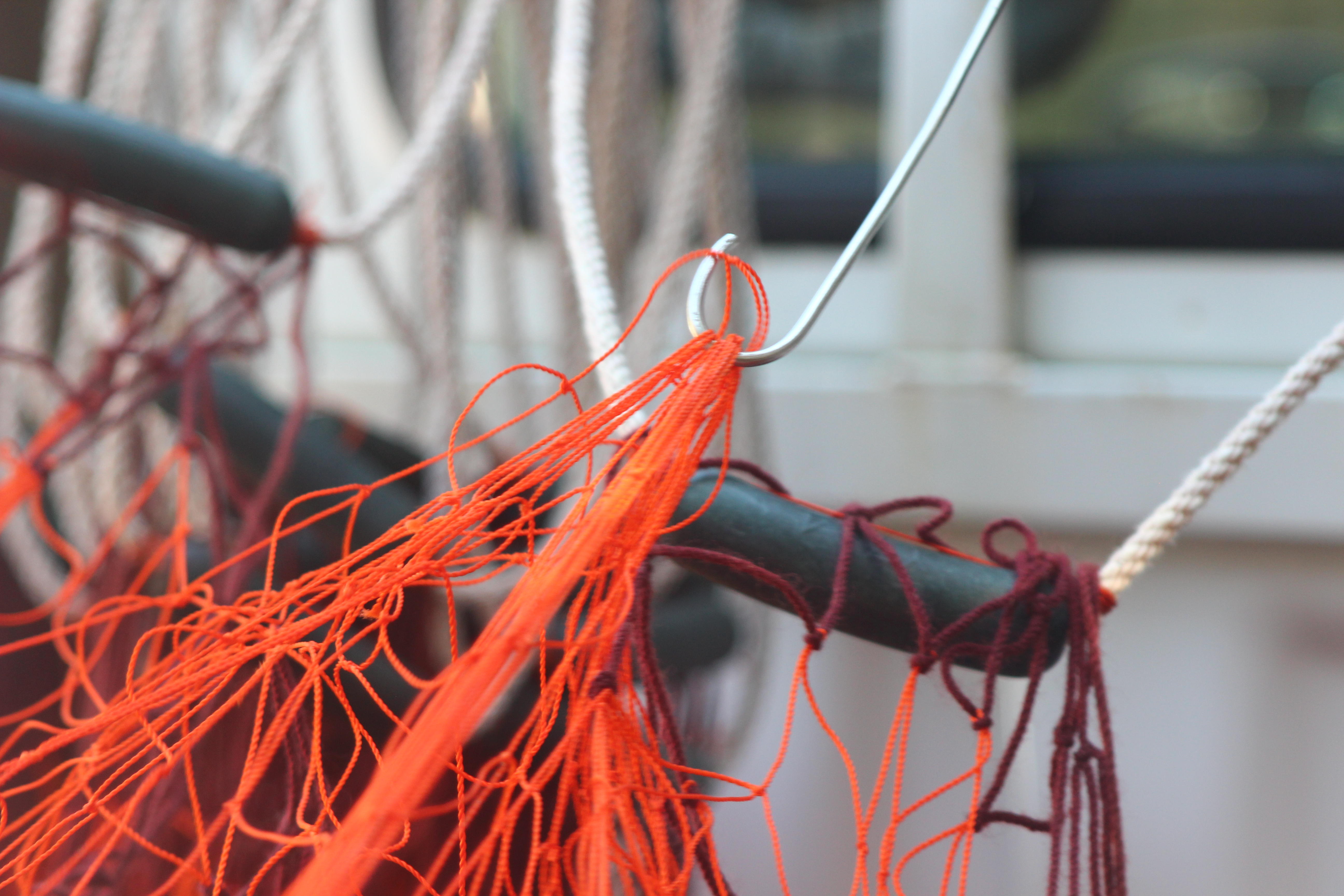 1枚の網に錘が付いている方と浮きが付いている方があるので、仕掛けると海底から赤いカーテンが並ぶような形になるそうです。