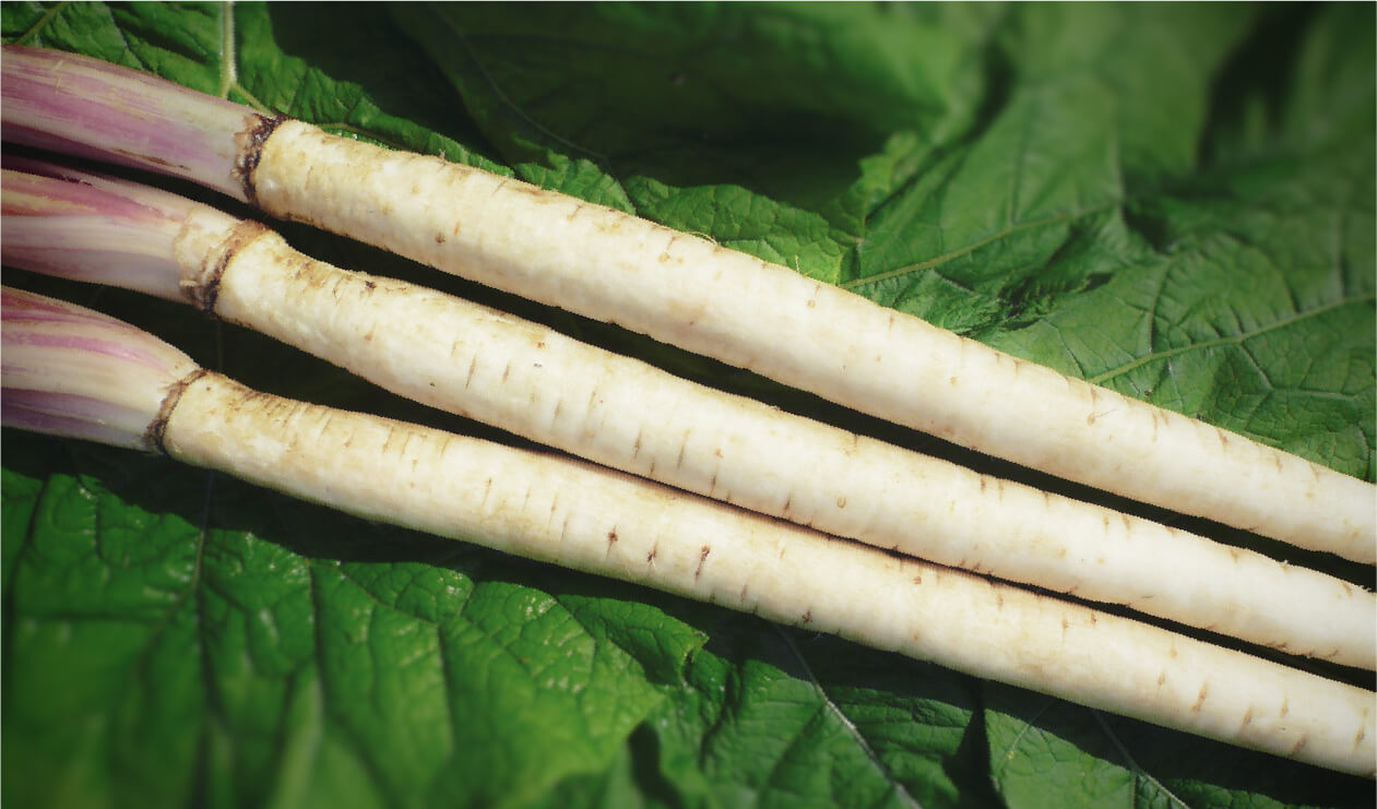 宮崎県内最大の新ごぼう産地のくしま。色白で皮が薄く柔らかく、上品な香りが特徴の新ごぼう。乾燥防止とアク抜きのためにすぐに水に浸し、一本一本手作業で洗うと、だんだんと白肌に。一手間かけた新ごぼうは、柔らかくアクも少ないので、下処理も簡単。薄くスライスして、サッと水にさらす程度にアク抜きしたら、さっと茹でるだけでサラダにも最適。